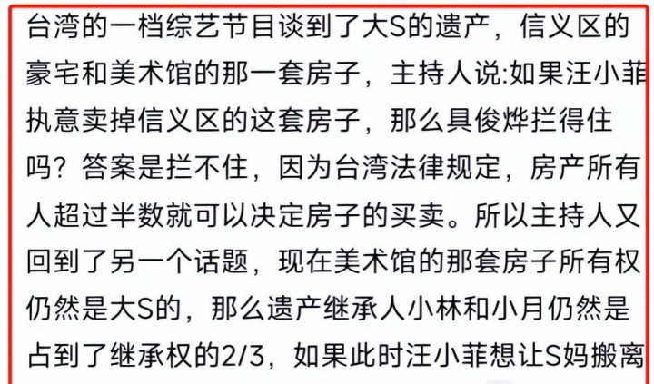 于是,汪小菲果断宣布,将大S留给孩子们的遗产全部信托。